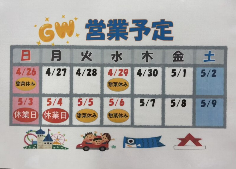 ゴールデンウイーク中、5月3日、5月4日お休みさせて頂きます。